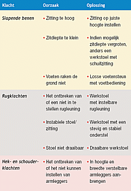 Een kleine afwijking van de juiste zithouding kan op den duur leiden tot irritaties, vermoeidheid en een verminderde concentratie. Na verloop van tijd komen de eerste gezondheidsklachten, als pijn in de nek, rug, schouders en bovenbenen. Met als mogelijk gevolg, langdurig ziekteverzuim en alle kosten van dien. Dergelijke klachten treden overigens niet alleen op bij zittend werk. Ze kunnen ook voorkomen als mensen langdurig in dezelfde houding staan of veelvuldig dezelfde beweging maken.
